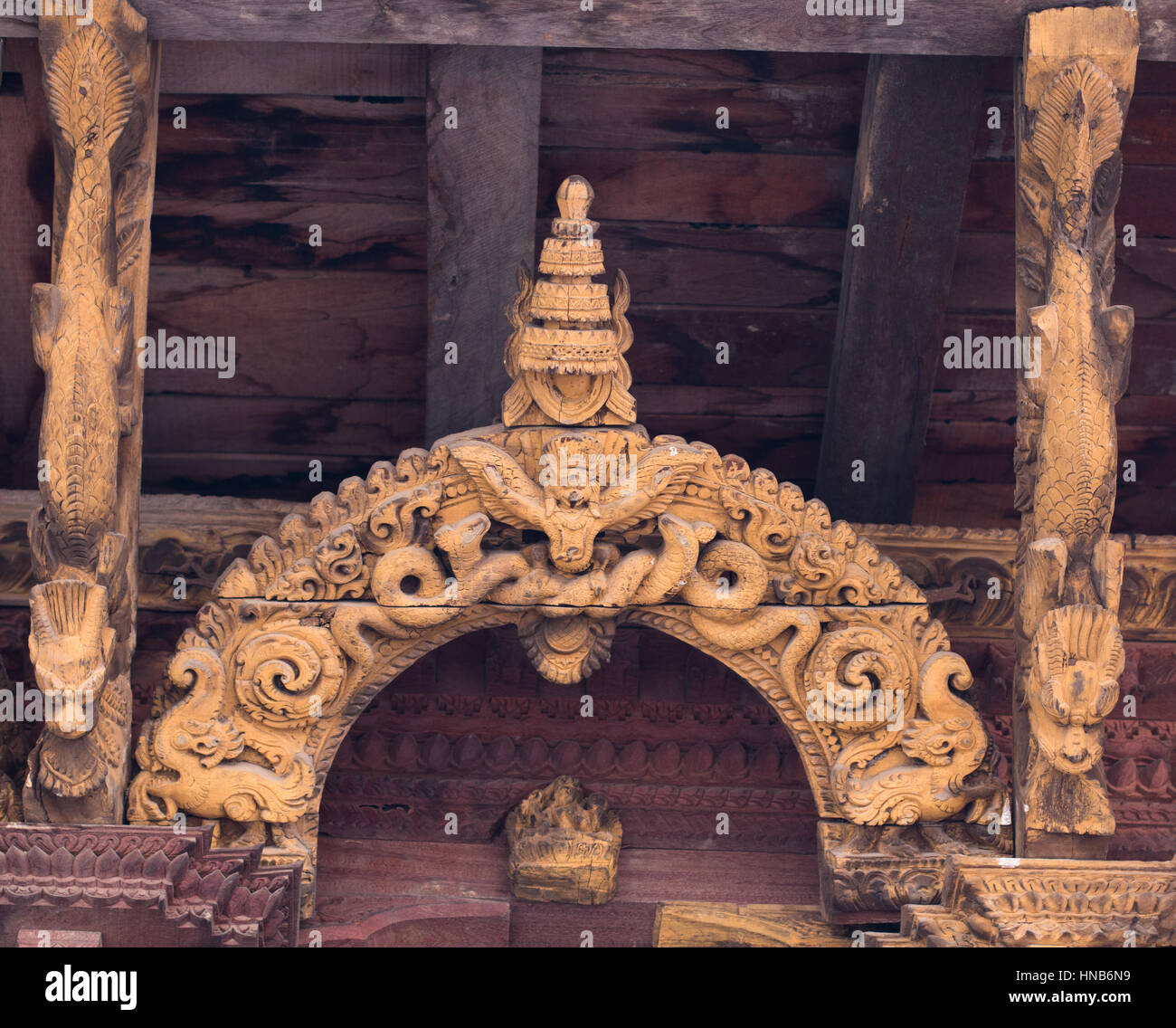 Carved Decorative Wooden Arch In A Temple In Bhaktapur Kathmandu