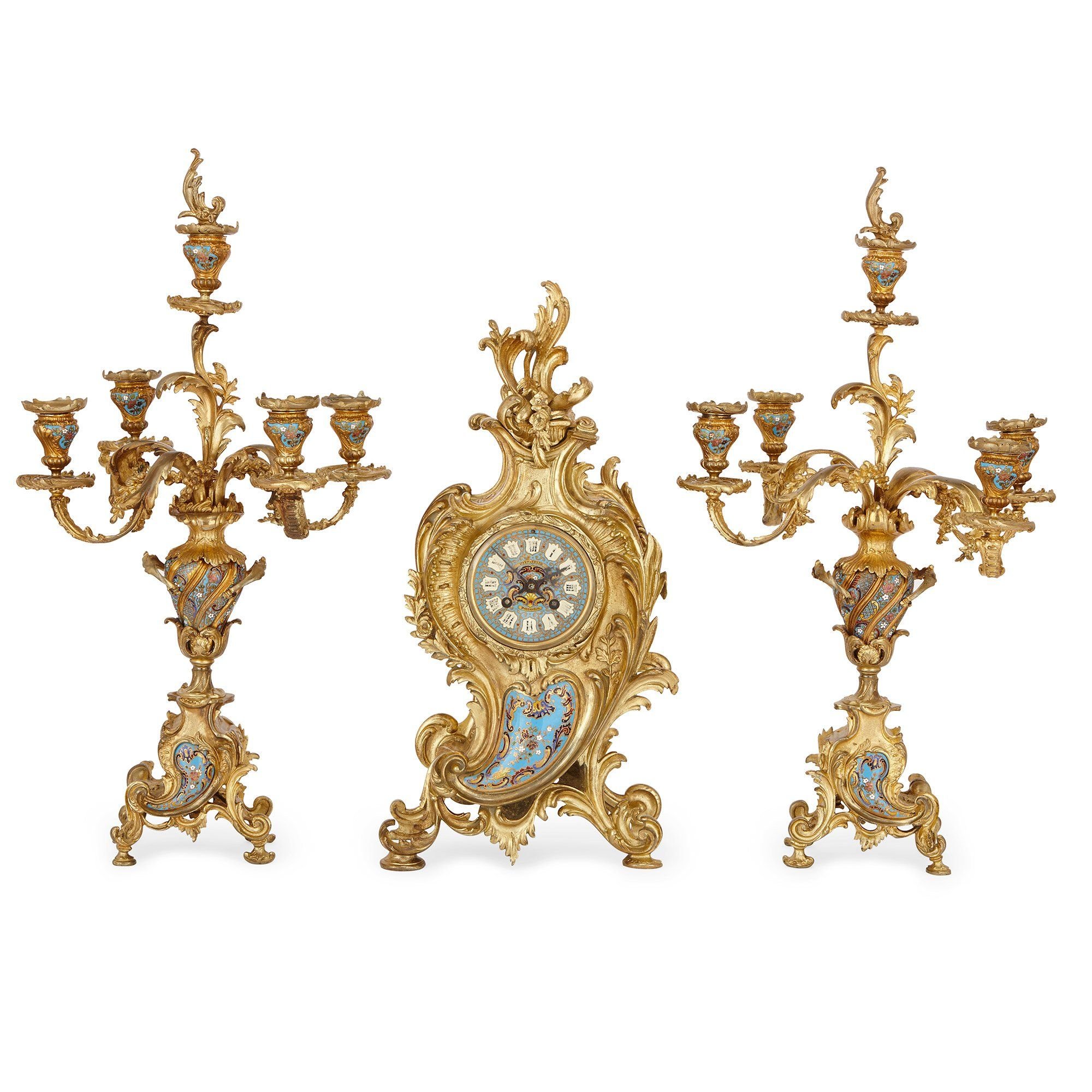 Rococo Style Champleve Enamel And Ormolu Three Piece Clock Set