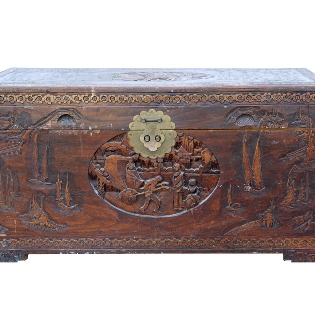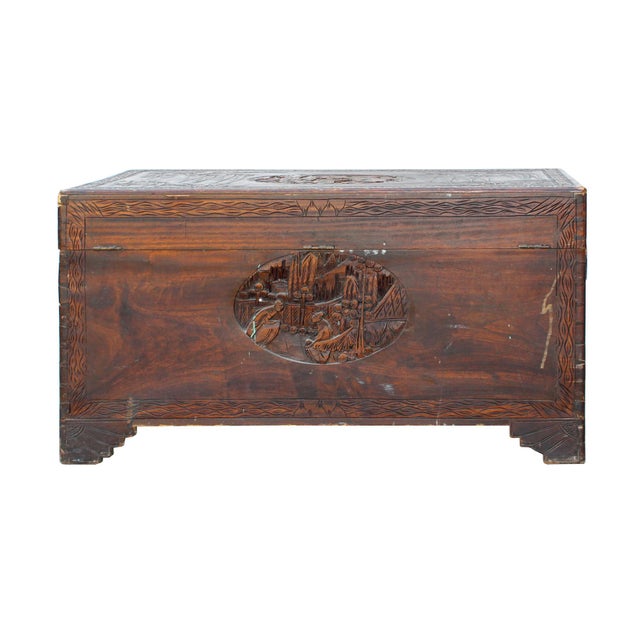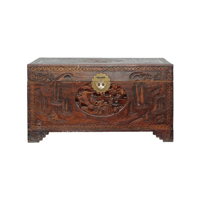 Oriental Asia Brown Relief Scenery Motif Carving Trunk Table