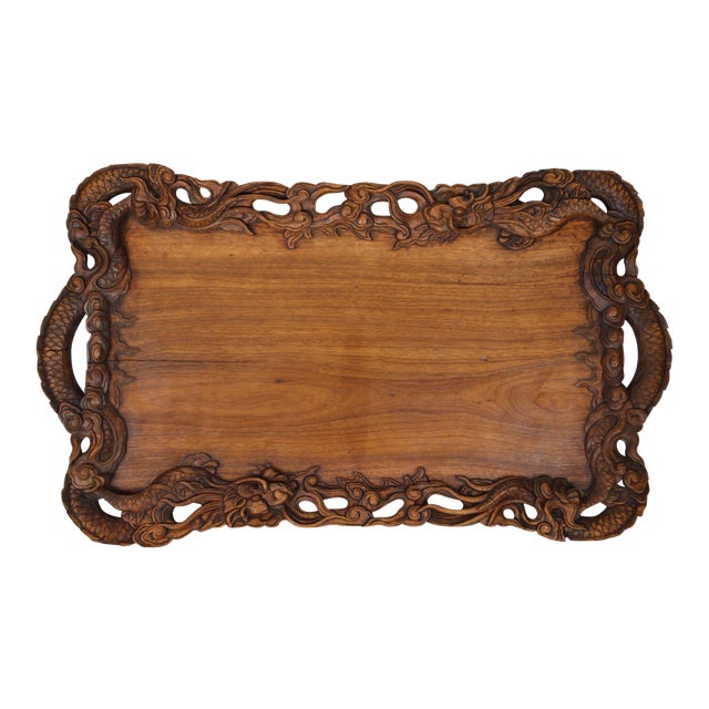 Asian Carved Wood Mythological Dragons Theme Tray Circa 1900