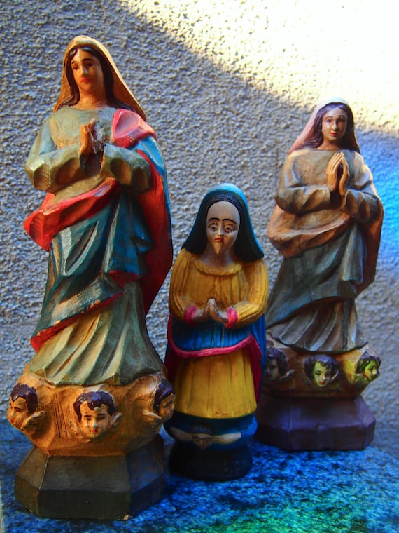 3 Religious Statues Of Virgin Mary Wood Carved By Folk Etsy