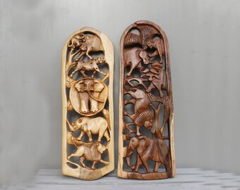 African Wild Jungle Elephant Wooden Carving Sculpture Wall Hanging