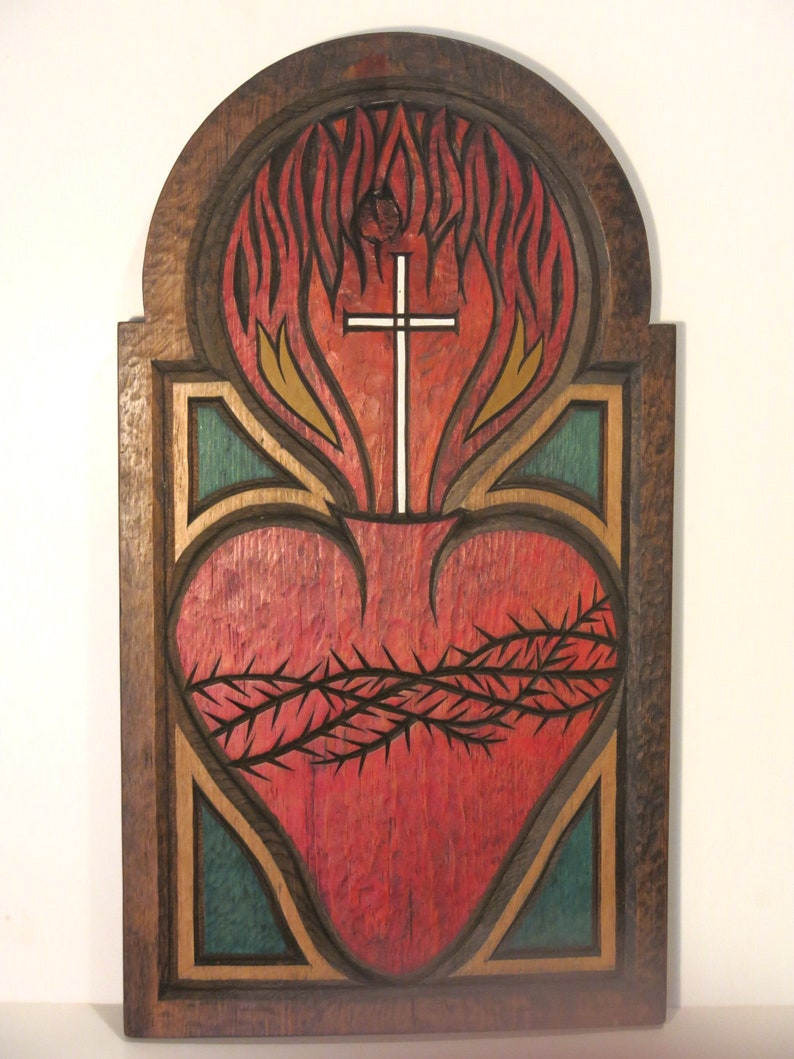 Rare Sacred Heart W Flames Cross Wood Plaque Carving Ron Etsy