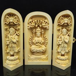 3pcs China Boxwood Carving Wood Guanyin Bodhisattva Buddha Statue