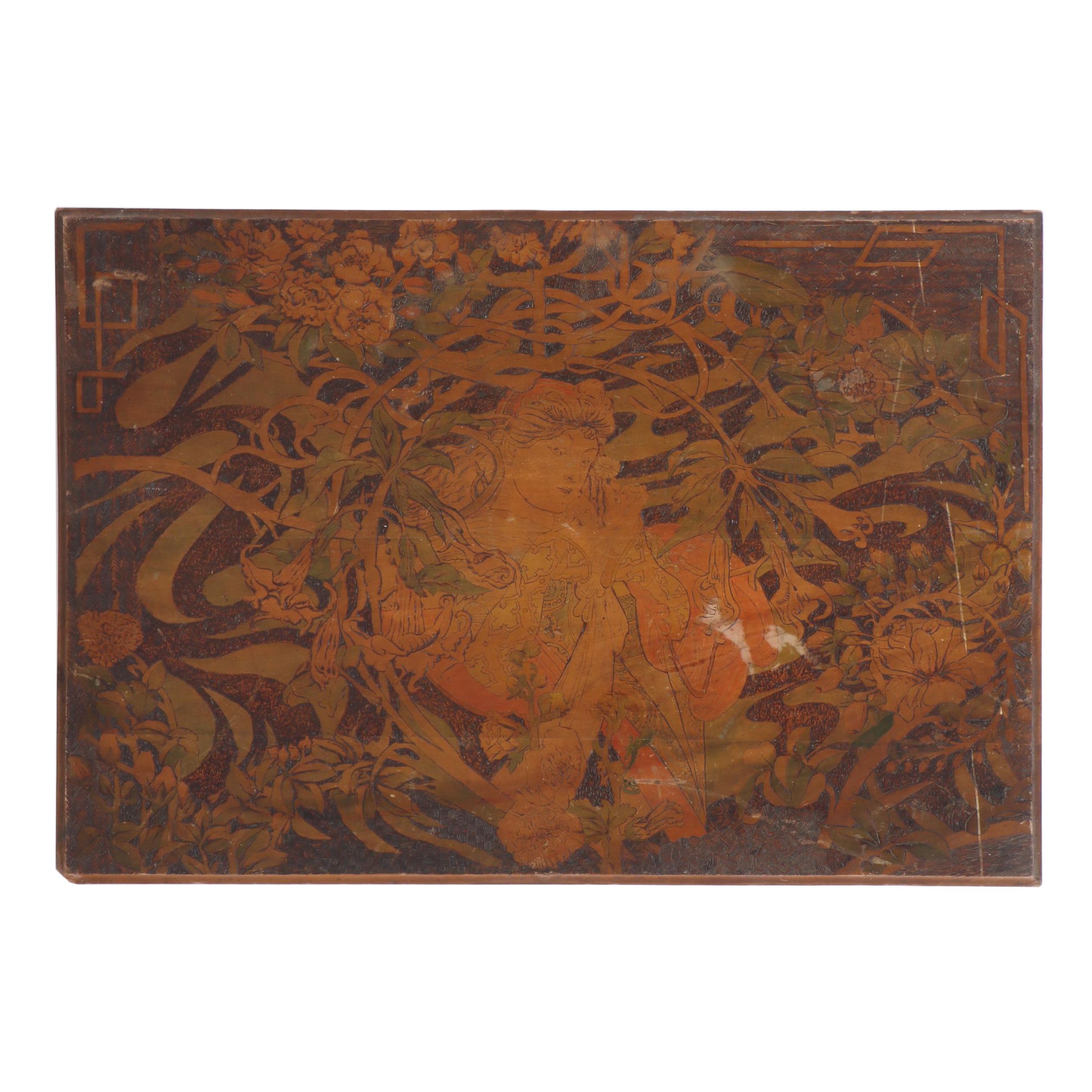 Pyrography Box Art Nouveau Lg Vintage Flemish Wood Carved Lady
