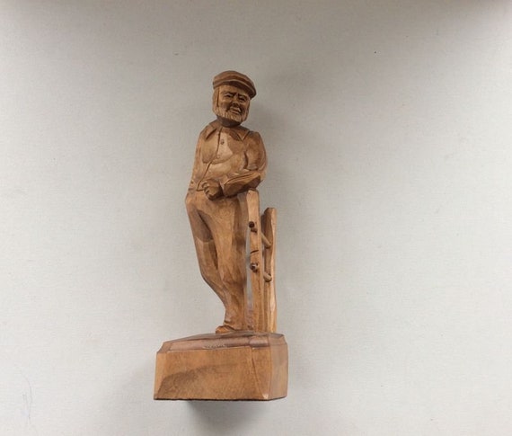 Vintage French Caron Wood Carving Statue Old Man Figure Fait A La